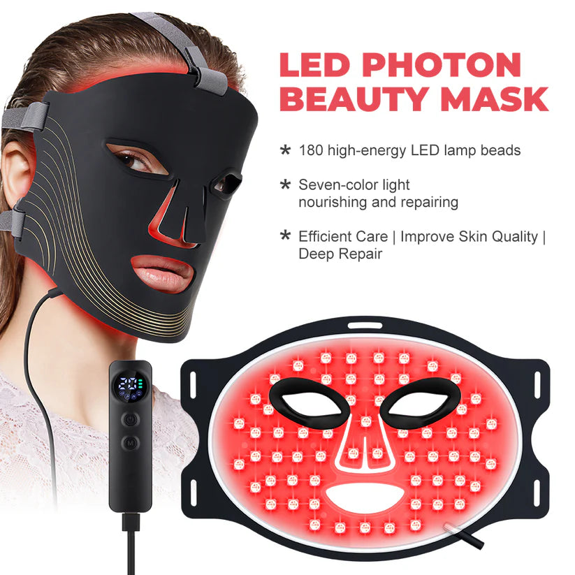 This at-home LED photon face mask utilizes 180 multi-colored light beads to deliver seven types of light therapy at three adjustable brightness levels, targeting concerns like fine lines and dullness while promoting cellular rejuvenation for a more radiant complexion. Crafted from ultra-thin, flexible food-grade silicone, it contours comfortably to the face for extended use. With a convenient Type-C charging interface for quick power-ups, it offers an efficient, portable, and user-friendly skincare experience suitable for daily beauty rituals.